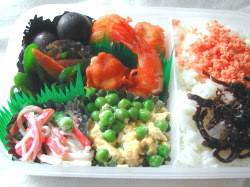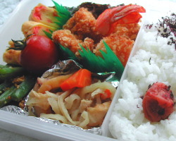 エビフライ ホタテ貝柱フライ 切干大根の煮物 (にんじん・うす揚げ・イカてん) インゲンのピーナッツ和え たまご焼き(紅しょうが) ぷちトマト ごはん(ゆかり&うめぼし) 昨日の夕飯は八宝菜・・そのえびとホタテを取り分けて夜のうちにパン粉をつけて冷蔵庫・・朝は揚げるだけ・・ お弁当の中に煮物を何か入れていたい・・切干大根は子供たちの好物・・♪ |