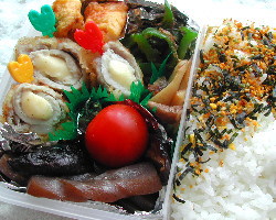 こんにゃくとしいたけの煮物 エリンギのバターソテー ピーマンのおかか炒め たまご焼き(ちくわのみじん切り) 豚肉のチーズフライ ぷちトマト ごはん(のりたま&うめぼし) |