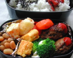 ハンバーグ ブロッコリーのマヨネーズ和え たまご焼き(プレーン) 大豆の煮物 ちくわチーズのてんぷら ニンジンのバターソテー ごはん (ごま塩&うめぼし) 昨晩は和風ハンバーグ 和風あんに大根おろしからませていただいた・・・で・ 今日のお弁当はその時にいっしょに小さく作っていたもの あぁ・・また・・始まった・・。; |