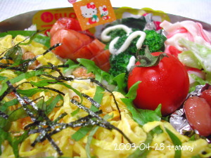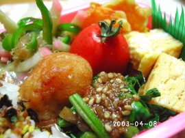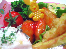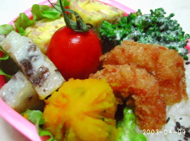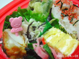 たまごやき(ねぎ&ハム) 菜の花の胡麻和え エビのチリソース さつまいもの天ぷら カニサラダ ぷちとまと ごはん(塩昆布) |