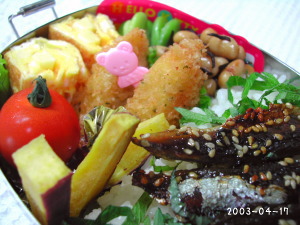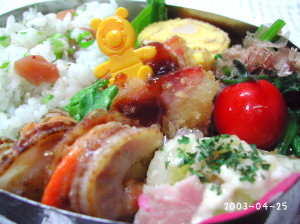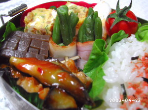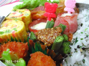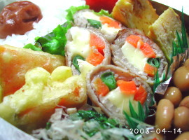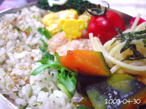 たまごやき(なめたけ) 豚肉ロール(チーズ&にんじん&いんげん) かぼちゃの天ぷら ほうれんそうのおひたし 五目豆 ぷちとまと ごはん(うめぼし) また・・いつものお弁当の時間がはじまりました・・ さぁ・・がんばってこの一年もいきましょうね♪ |
