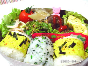 たまご焼き(青海苔) ハンバーグ(チーズ入り) たけのこの煮物(おかか和え) コールスローサラダ 菜の花の胡麻和え ぷちとまと おにぎり(のりたまシート&青菜) テレビのCMを見ていて どうしてもこの「のりたまシート」を買ってと娘・・^^ で・・本日はリクエストに答えておにぎりに・・♪ |