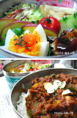 ゆでたまご じゃがいものお好み焼き フライドポテト きゅうりスティック 照り焼きチキンとキャベツのサラダ さつまいもチップ ぷちとまと ドライカレー (ひき肉・ピーマン・たまねぎ・コーン・アーモンド) 子供たちの大好きなドライカレー 案外これって簡単おべんとうです♪ らくちん・・♪ |