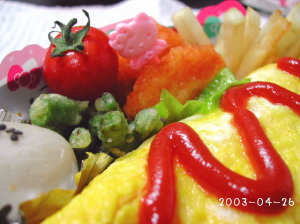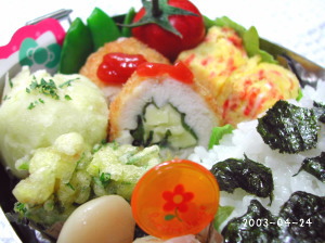 たまごやき(ねぎ&紅しょうが) かにクリームコロッケ いんげんの胡麻和え うずら卵のベーコン巻き揚げ さつまいもの天ぷら ごはん(青菜ふりかけ) ぷちとまと撮影時に入れるのを忘れたぁ・・(;^_^A アセアセ・・・ さつまいもの天ぷらはさつまいもに少しだけお砂糖まぶし天ぷら粉を牛乳でといて揚げます・・ ちょっと甘めのおやつ感覚・・♪ |