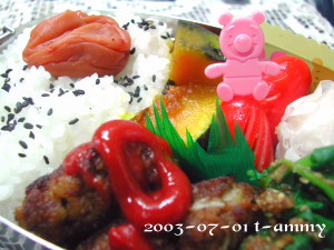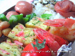 エビの中華街のから揚げ たまごやき(ねぎ&紅しょうが) 大豆の煮物 いんげんのサラダ チーズ入りウィンナー ぷちとまと ごはん(うめぼし&ちりめんふりかけ) 暑くなってきたり テスト週間や お休みや・・おべんとうを作る機会がとても減ってきてありがたさと・・さみしさ?が入り乱れる複雑な心境・・ |