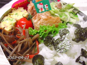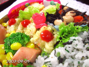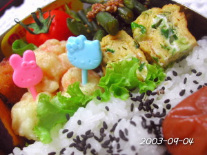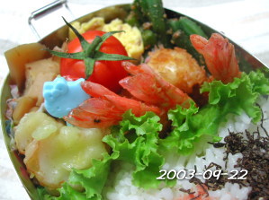 たまごやき(ねぎ) いんげんの胡麻和え エビ・ホタテ・イカの寄せ揚げ 野菜天 さつまいもの素揚げ ぷちとまと ごはん(ごましお&梅干し) |