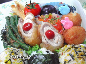 豚肉のチーズ巻き(中華街のから揚げ粉) ウインナー ほうれん草の胡麻和え ぷちとまと オムスパ |