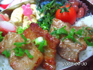 かにかまぼこの天ぷら たまご焼き(なめたけ) にんじん葉の胡麻和え きんとき豆 ぷちとまと 豚肉のしょうがやき丼 |