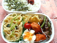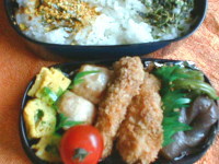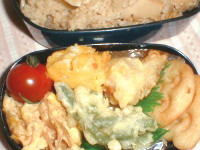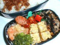人参のかき揚天ぷら ウィンナーのケチャプ炒め 五目煮(ひじき&人参&油揚げ&ちくわ) たまごやき(青海苔&ちくわ) 塩茹でブロッコリー ごはん(醤油おかか) |