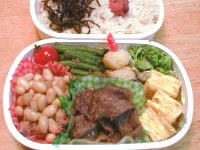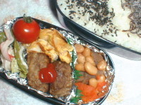 レタス&絹さや&かにかまサラダ たまごやき(ちくわ・青のり入り) 五目豆(大豆・こんにゃく・人参) ハンバーグ(チーズ入り) プチトマト ごはん(ごま塩・塩昆布) ハンバーグは前日夕飯の時に別に作ったもの 中にはプロセスチーズを細かく切っていれてある 久々 豆から水で戻して煮た五目豆 フリーズドライの大豆と歯ごたえが違って豆の味がする |