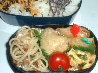 なめこ・きのこスパゲティ ふくさ煮 筍の天ぷら たまご・ねぎ焼き プチトマト ごはん(のりたま&塩昆布) |