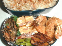 ぜんまいの煮物(油揚げ&人参) たまごやき(ハム) エビフライ 帆立の甘辛煮 ベーコンとグリーンアスパラ炒め 玄米ごはん(牡蠣醤油ゴマふりかけ) |